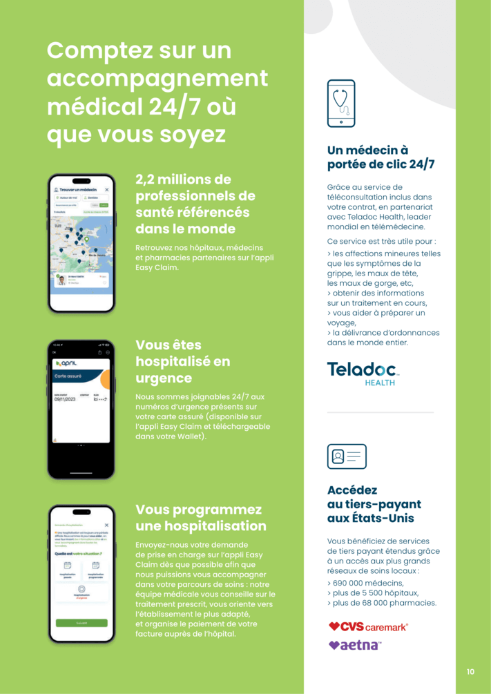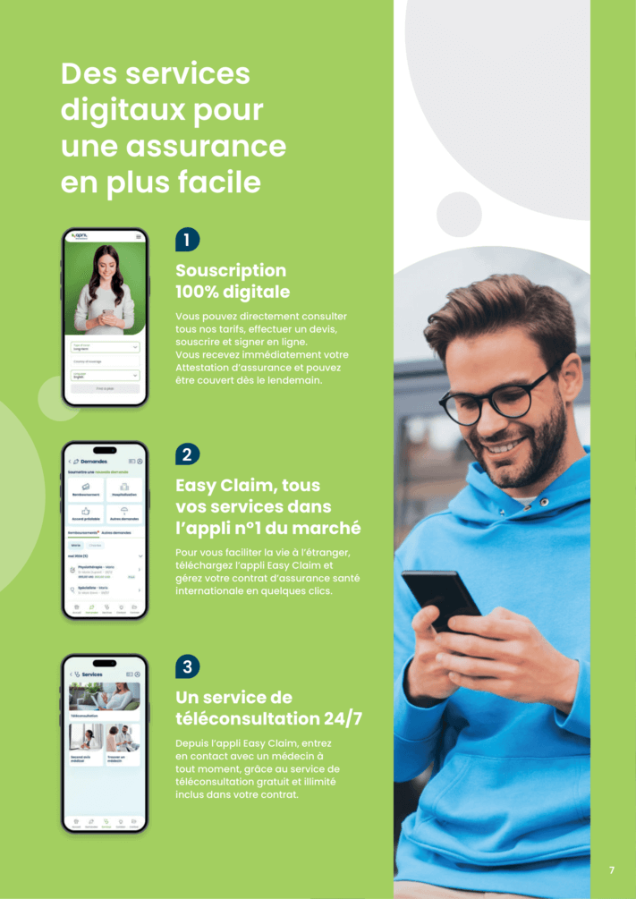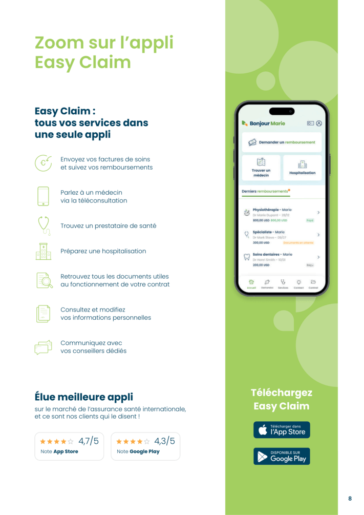 - Remboursements en 48h via l’appli mobile Easy Claim qui permet d’envoyer ses factures rapidement et sans frais jusqu’à 1 000 €/US$ par facture.