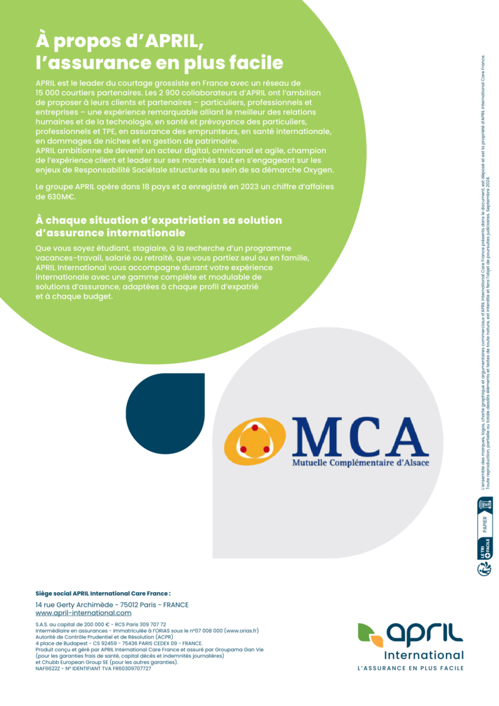 Un package d’assurance complet couvrant les risques de santé et d’assistance au 1er €, en complément de la Caisse des Français de l’Etranger, de la Sécurité Sociale française et de la C.E.A.M.