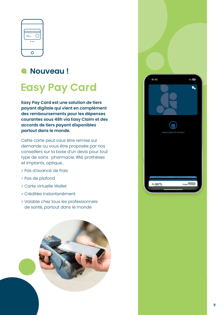 - L’accès à l’application Easy Claim permettant de déposer ses factures jusqu’à 1000 € en quelques clics, d’effectuer une demande de prise en charge hospitalière, d’accéder à sa carte d’assuré dématérialisée…
